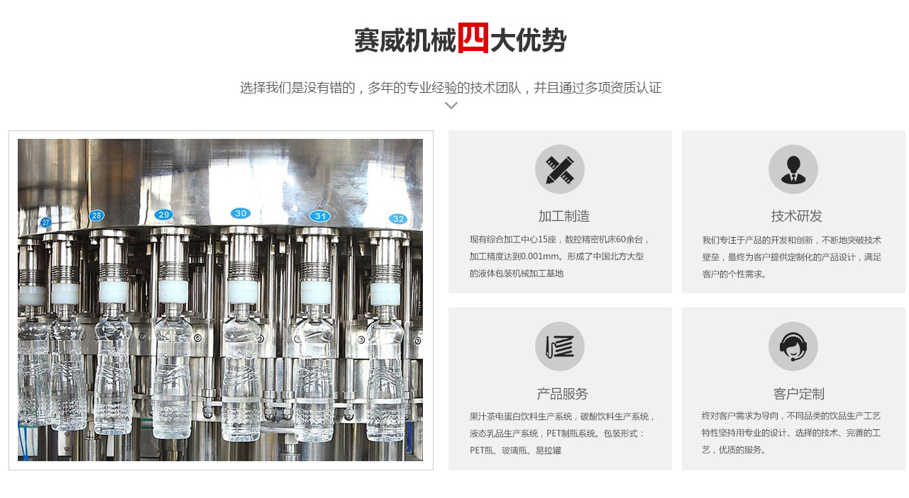张家港市饮料机械有限公司Q江苏赛威)是一家专业从事饮料啤酒灌装包装自动化生U设备及成套水处理设备设计制造的企业。是中国饮料啤酒装备行业的核心骨q企业,是中国较早从事生产液体灌装设备的厂家之一Q是2008TOP中国食品工业十大民族刉商。目前已成ؓ中国中小型饮料啤酒灌装设备制造商?br />     公司占地面积68亩,拥有国际化标准厂?1600余^方米Q固定资?500多万元。公司先后投入巨资,从日本、美国引q精?加工中心{先q加工设备,实现了从产品设计、生产、销售、售后服务一体的C化管理体制。在同行业中率先通过ISO9001国际质量体系认证及欧盟CE认证。是全国刉饮料机械标准化技术委员会单位,参与多项国家及行业标准的制订。江苏省二计量认单位Q江苏省重合同守信用企业。张家港市企业信息化C企业?/div>
